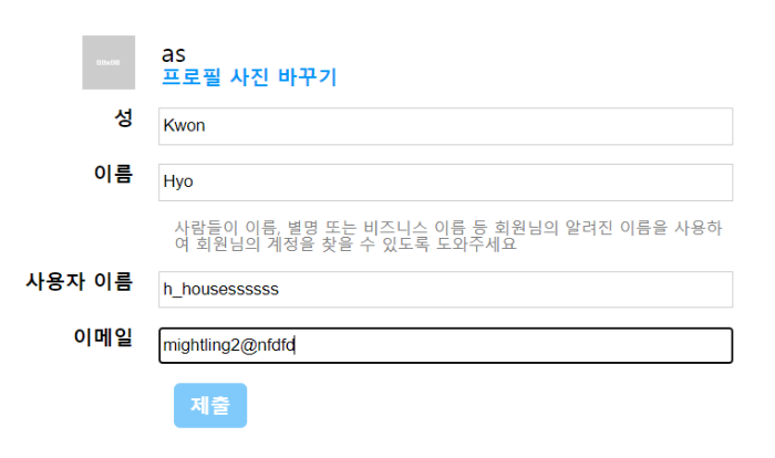 형식에 맞지 않는 이메일을 써도 프로필페이지로 리다이렉트 되고 다시 편집창으로 들어가면 DB에 저장되지 않은 모습