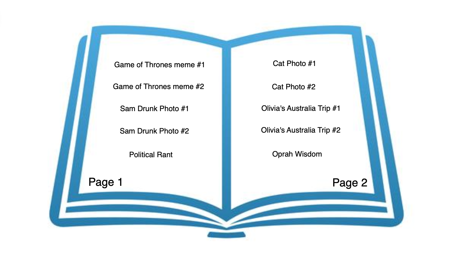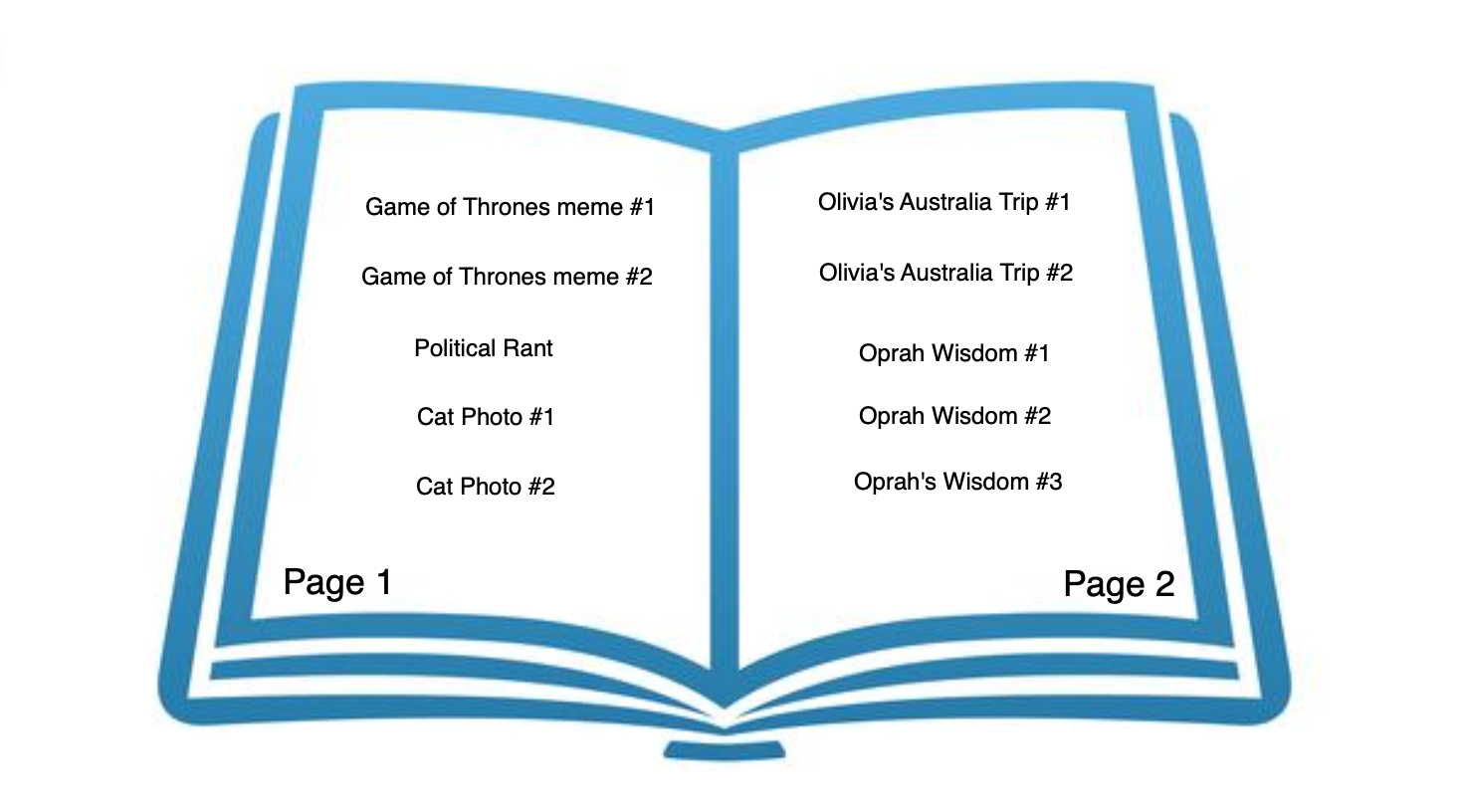 우리는 고양이 사진을 볼 수 없다. 이전의 게임 정보, Sam의 사진, 정치 의견과 호주 여행 사진 2개와 오프라 인용문 3개의 피드만 볼 수 있을 뿐이다. 왜냐하면 오프셋 페이징은 데이터가 수정되는 것을 신경쓰지 않는다. 그저 단순히 쿼리 결과문의 다음 5개의 피드를 받을뿐이다. 데이터베이스는 아마 이런식으로 수행될 것이다.