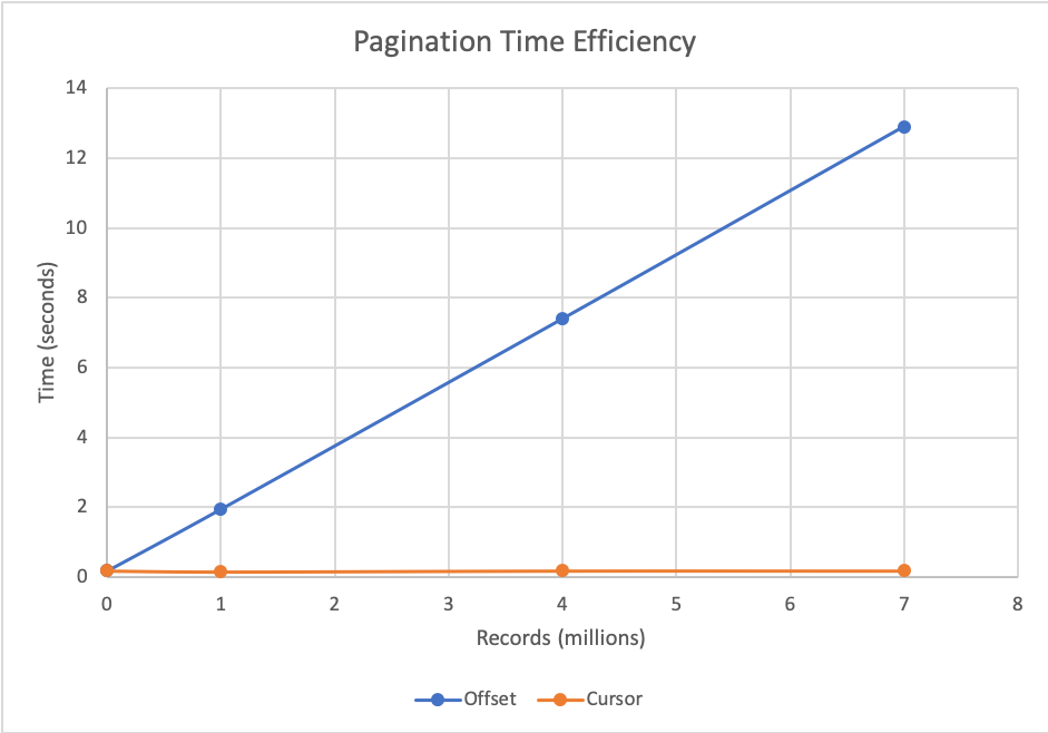 이건 오프셋 숫자가 커질수록 큰 문제가 된다. 대략 700만개의 레코드 데이터에 대해 커서 및 오프셋 쿼리를 테스트하고 나서야 이해할 수 있었다.