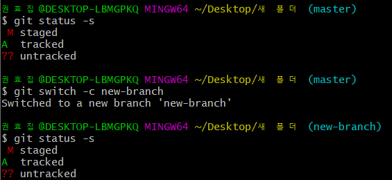 브랜치 간 이동에서는 커밋되지 않은 변경된 파일은 같이 이동된다. 이 부분이 좀 헷갈렸는데, 브랜치 이동은 커밋되지 않은 파일은 신경쓰지 않고 커밋 로그만 신경쓴다고 생각하니 이해하기 편했다.