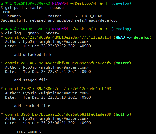 만약 브랜치에서 다른 브랜치의 변경사항을 반영하고 싶은 경우에는 fetch 혹은 pull을 사용한다. --rebase 옵션을 사용하면 좀 더 깔끔한 히스토리를 만들 수 있다.