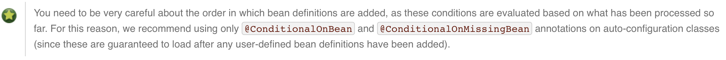 - Conditional 어노테이션을 활용할 순 있지만, 뒤에서 볼 auto-configuration과 다르게 Bean 등록 순서가 보장되지 않아, 스프링 공식문서에서도 추천하지 않는 방법이다.