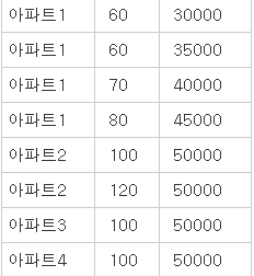 데이터 생성 with t (col1, col2, col3) AS ( SELECT '아파트1', 60, 30000 FROM DUAL UNION ALL SELECT '아파트1', 60, 35000 FROM DUAL UNION ALL SELECT '아파트1', 70, 40000 FROM DUAL UNION ALL SELECT '아파트1', 80, 45000 FROM DUAL UNION ALL SELECT '아파트2', 100, 50000 FROM DUAL UNION ALL SELECT '아파트2', 120, 50000 FROM DUAL UNION ALL SELECT '아파트3', 100, 50000 FROM DUAL UNION ALL SELECT '아파트4', 100, 50000 FROM DUAL) 방법1 :..